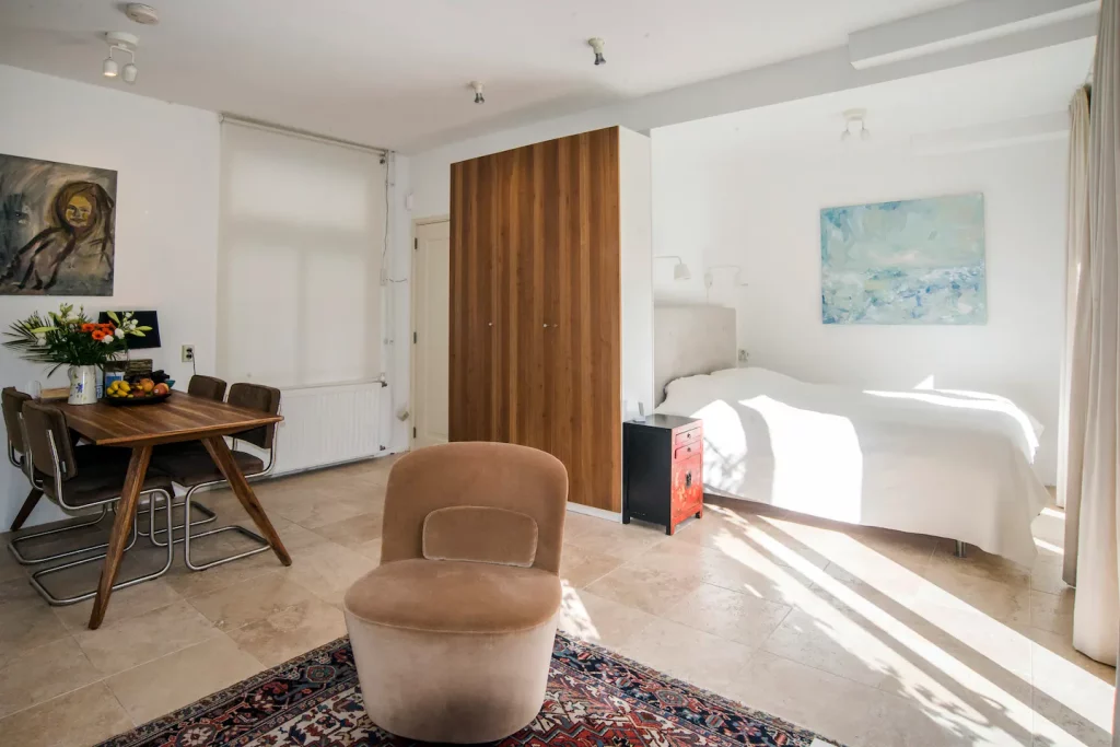 This is a very privat ground floor studioapartment( so no steep stairs) with your own privatgarden , in the peaceful so called backhouse of our canalhouse at the Amstel river. extremely central yet very quiet. A privat marble bathroom/ toillet, privat kitchen+ privat (Miele) washingmachine / dryer(etc.).2 minutes away from Central Station( subway), 9 minutes from World Trade center(subway). The subway entrance is 2 minutes
